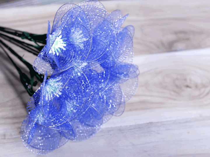 The net fabric gives each petal a soft, airy texture, creating a delicate yet eye-catching floral display.
