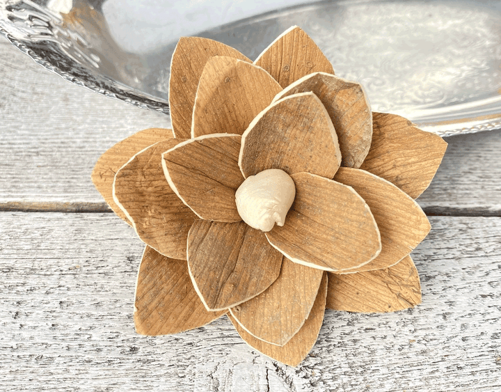 The Bobby flower is distinguished by its carefully layered petals, often presented with a combination of ivory-white tones and visible bark âskinâ for added character and natural beauty. Each piece is individually shaped by skilled artisans, ensuring unique details and a refined yet rustic look. Measuring approximately 6 to 8 cm, the Bobby Sola Wood Flower works well for bouquets, home decor, events, and crafts.