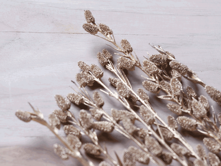 Unlike fresh floral elements, the Dried Exotic Litchi Golden Stick is long-lasting and requires minimal care. Simply dust occasionally with a soft cloth to maintain its shine. Store in a dry space away from moisture and it will retain its golden glow for years, making it a practical and reusable décor option.