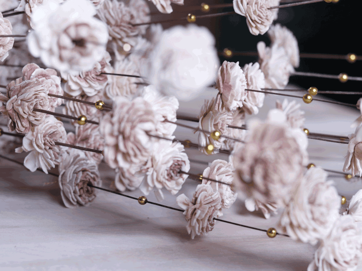 Every Off-White Coco Belle Moti Sola Wood Flower Stick is individually handcrafted by skilled artisans. Each petal is carefully shaped to mimic the soft curves of natural blossoms, while the coco-inspired design gives it a distinctive texture. The addition of moti embellishments adds a luxurious touch, giving the flower a refined sparkle that elevates its aesthetic appeal. Because each stick is handmade, every piece is unique, carrying its own charm and artisanal beauty.
