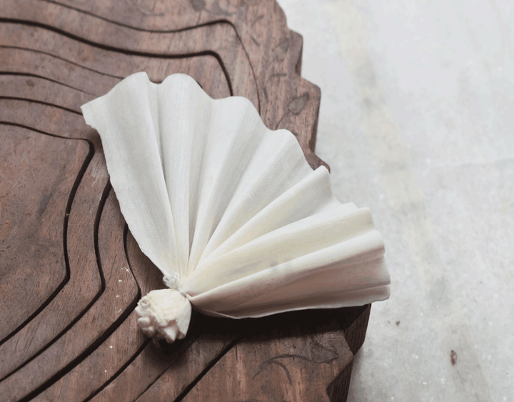 Inspired by the purity and simplicity of flowers, the fan features intricate sola wood petals woven into a graceful form—perfect for both casual and formal occasions.